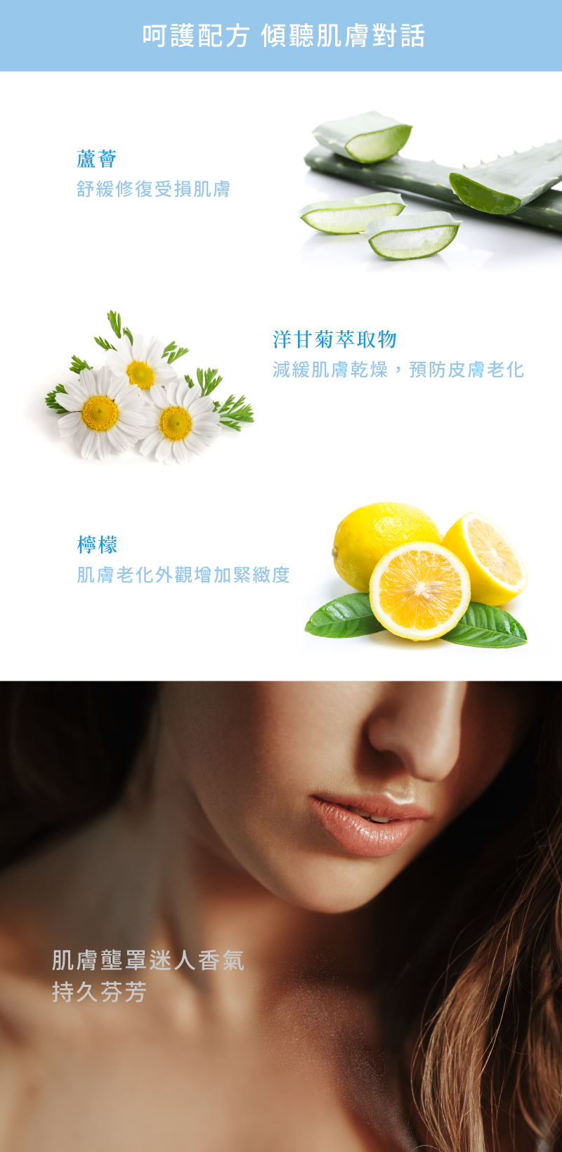 • 添加蘆薈與洋甘菊,舒緩受損肌膚