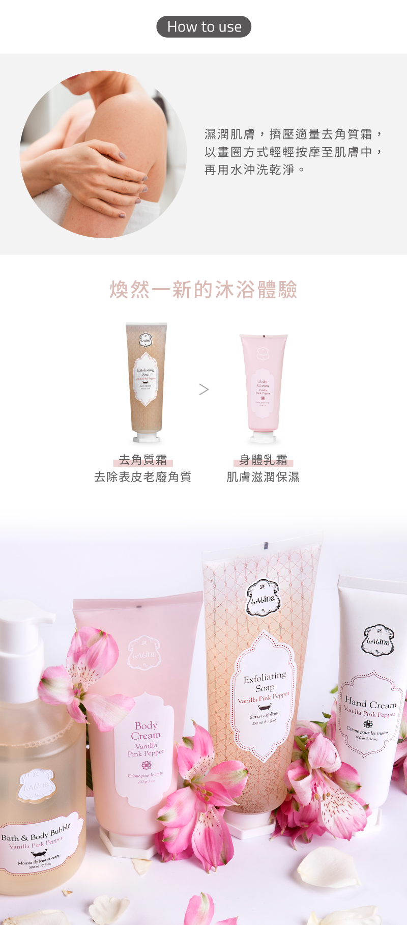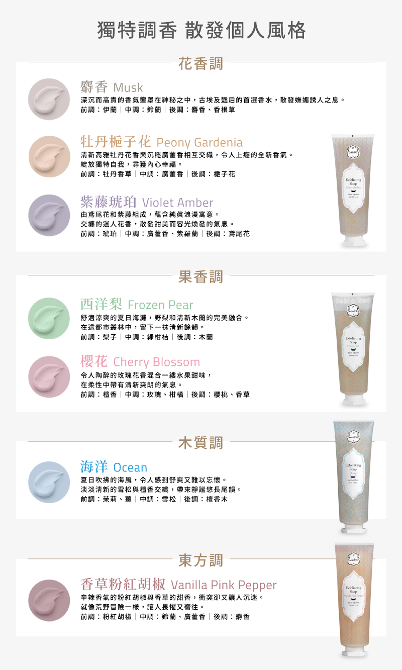 去角質霜溫柔拋光,舒芙蕾質地輕盈滲透,潔淨與滋潤同步進行,讓肌膚在香氣中重生。