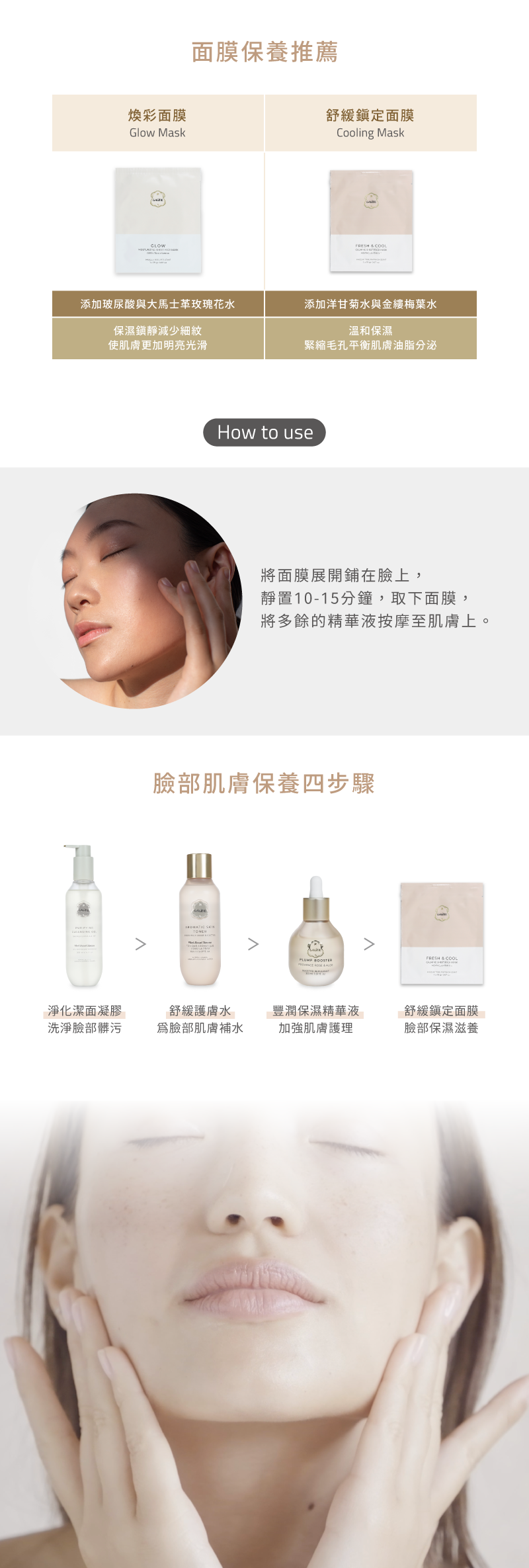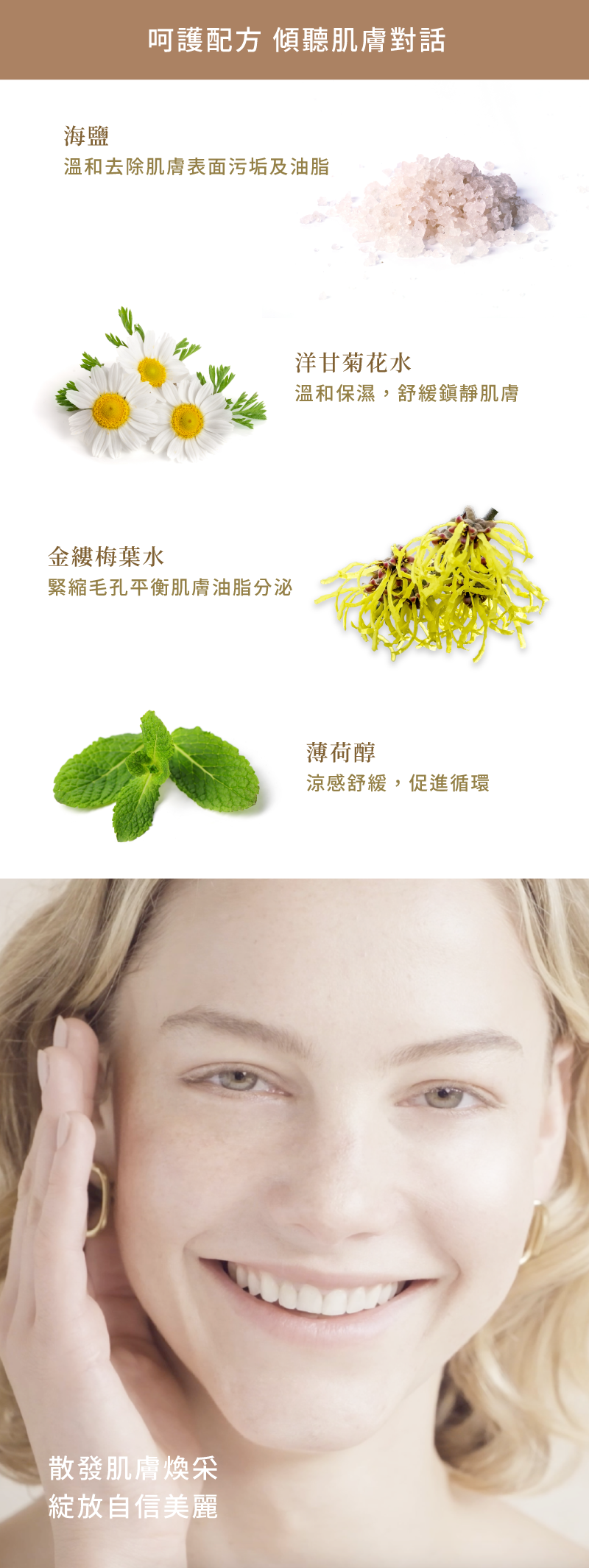 • 富含洋甘菊萃取物,舒緩修復肌膚