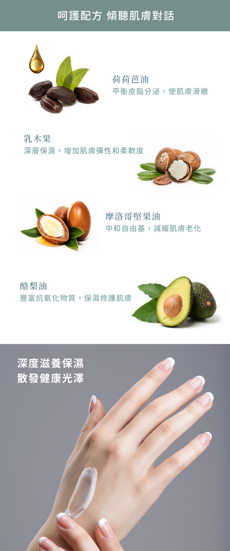 • 荷荷芭油與酪梨油肌膚柔嫩光滑
