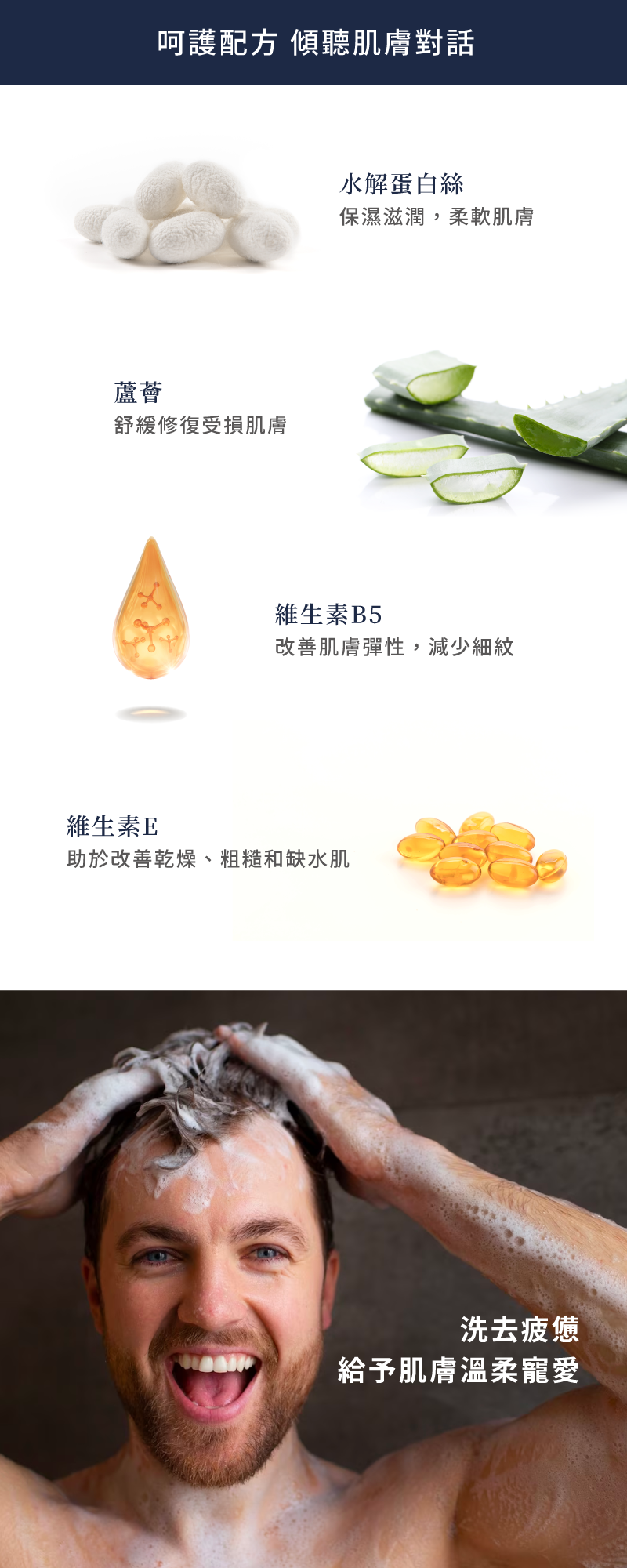 洗髮和沐浴露雙重作用。潔淨、清新、充滿活力淋浴。