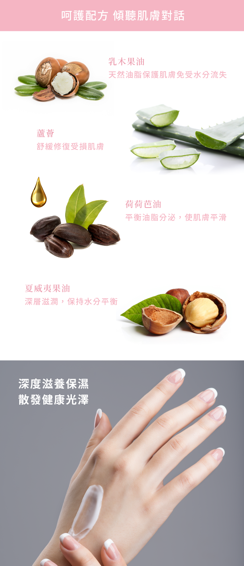 • 深層滋潤保濕,肌膚絲滑飽滿