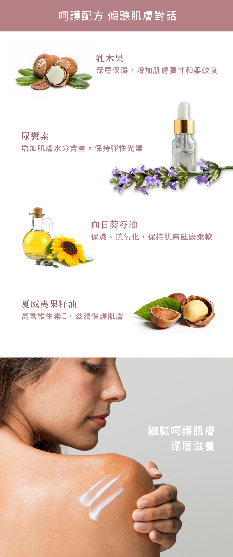 • 滋潤乾燥皮膚,保持肌膚水分平衡
